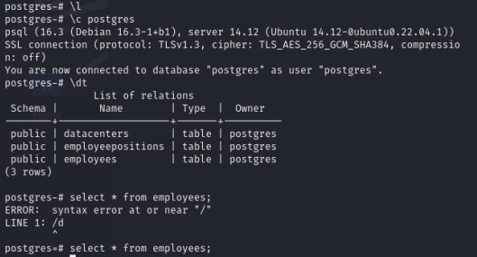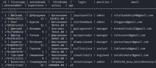 Проводим энумерацию существующих баз, таблиц. Выводим содержимое таблицы employees, где и находится флаг.