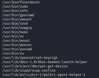 Используя предоставленные данные УЗ, получаем возможность удаленного выполнения кода через сервис ssh. Проводим энумерацию бинарных файлов с установленным suid-флагом (команда find / -perm -u=s -type f 2>/dev/null).