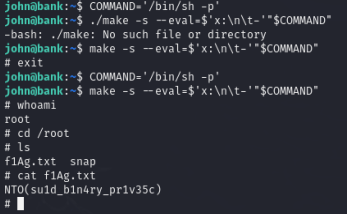 Среди выведенных бинарных файлов подмечаем файл make, которые предоставляет возможность локального повышения привилегий при наличии suid-флага. Повышаем привилегии на узле, читаем флаг.