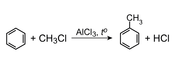 \[\ce{C6H6 + CH3Cl -> C6H5CH3 + HCl}.~ (\textit{1~балл})\]