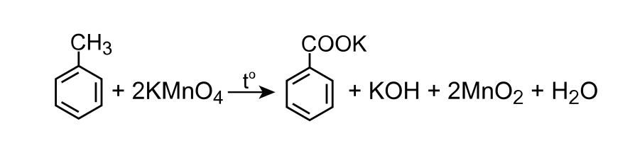 \[\ce{C_6H_5CH_3 +2KMnO_4 -> C_6H_5COOK + KOH +2MnO_2 + H_2O}.~ (\textit{1~балл})\]