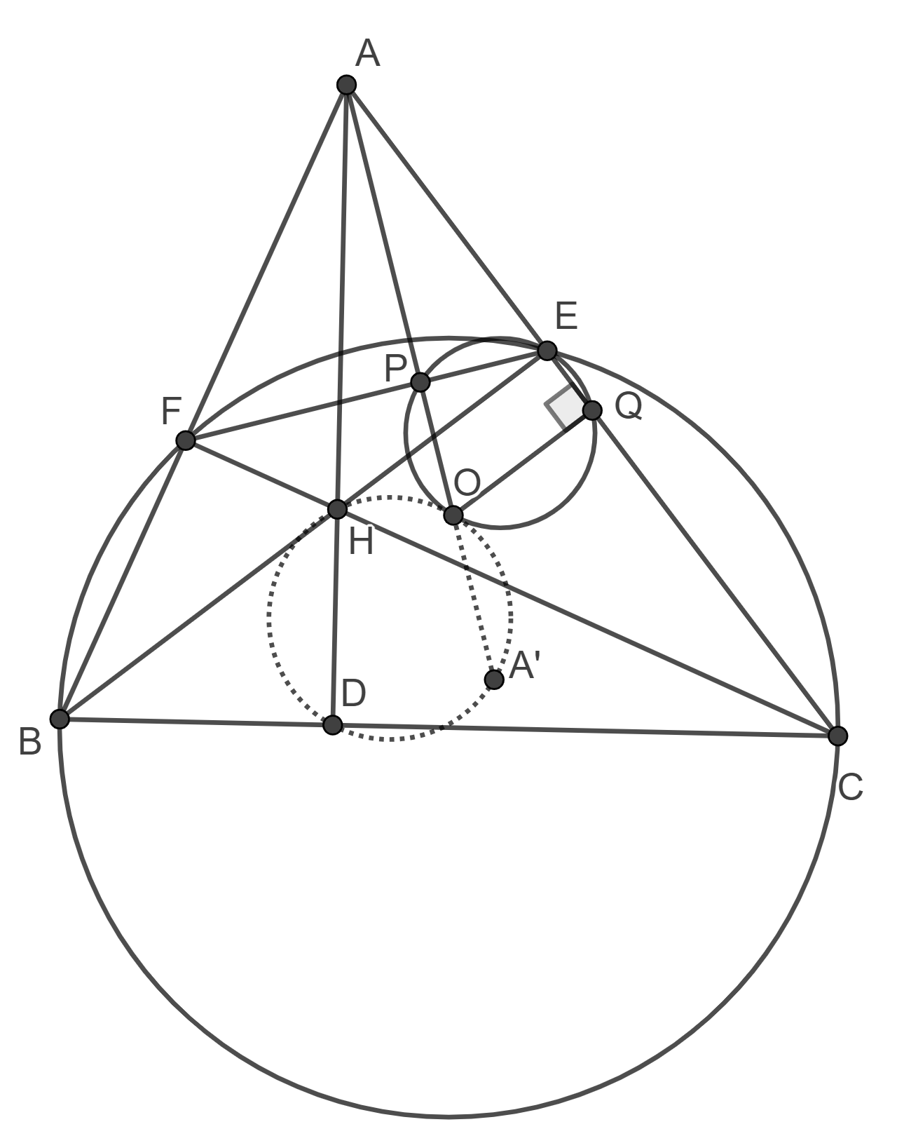 Тогда \[\angle OAC = 90^\circ - \angle B = \angle DAF.\] Из вписанности четырехугольника \(BCEF\) \[\angle AEP = \angle B.\] Тогда треугольники \(PEA\) и \(DBA\) подобны и \(\angle APE = \angle ADB = 90^\circ\). Получаем \[AO \perp EF,\] и точки \(A\), \(O\), \(P\), \(A'\) лежат на одной прямой.