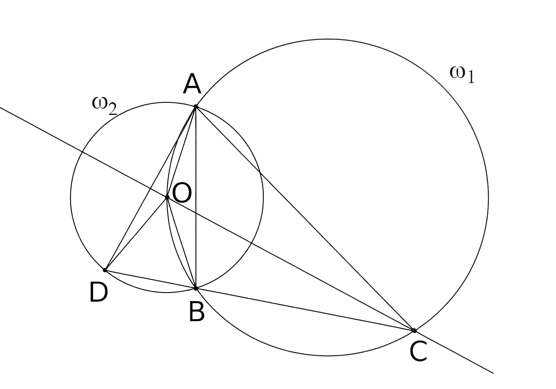 Таким образом, получаем \(OA = OB = OD\). Это означает, что \(O\) равноудалена от вершин \(A\), \(B\), \(D\) и является центром описанной окружности треугольника \(ADB\), а значит, и центром окружности \(\omega_2\).