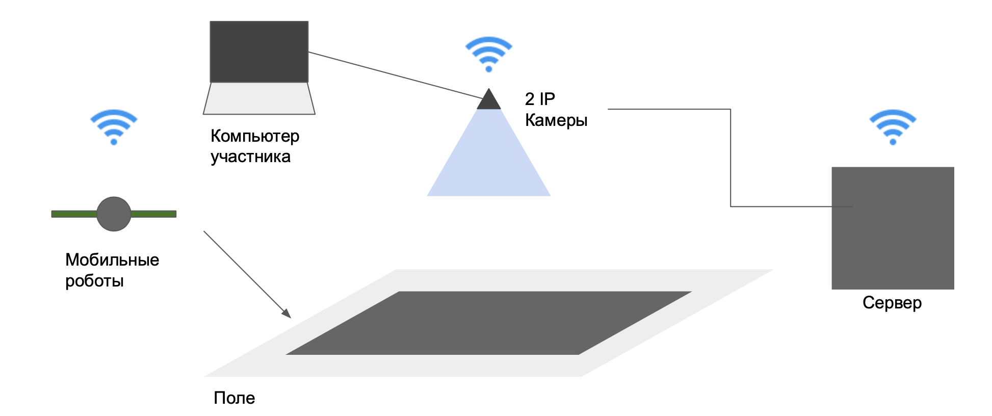 | Серверный ПK | Компьютер с установленной ОС Linux, подключенный к IP-камере и получающий команды от роботов (доступ по Wi-Fi или SSH) | Запуск пользовательских программ управления, обработка заданий, координация взаимодействия роботов и системы |