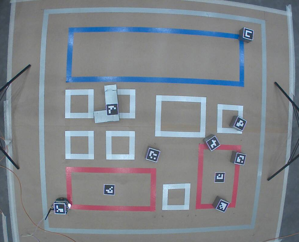 - Члены команды демонстрирует обработанное изображение с камеры, на котором обведены и подписаны все зоны, роботы и грузы (с которыми связаны ArUco-маркеры).