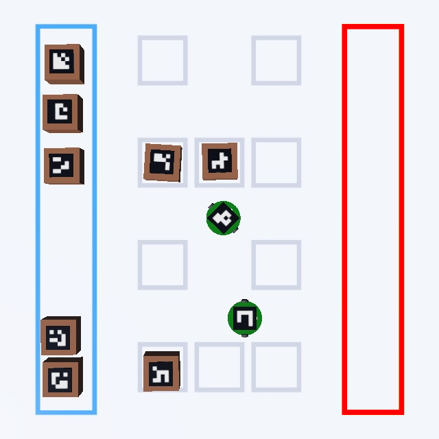 Команда должна написать программу управления роботом для перемещения небольших грузов на основе обратной связи по изображению. Для этого выдается задание на перемещение нескольких грузов, которые обозначаются ArUco-маркерами, расположенными на поле.