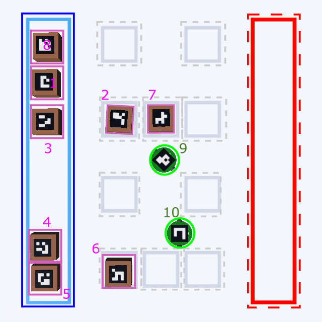 В части сегментации необходимо продемонстрировать судьям обработанное изображение с камеры, на котором выделены контуры всех зон, грузов и роботов. Для зон нужно добавить подпись или обозначения (для однозначной интерпретацией жюри) с их ID (при наличии). Контуры грузов и роботов следует обозначить разными цветами (в зависимости от типа выделенного объекта: зона, робот, груз) и подписать их ID (пример — см. рис. 5.1–5.2).