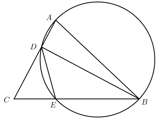 Четырехугольник \(ABED\) вписанный, значит, \(\angle ADE + \angle ABE = 180°\). Сумма смежных углов \(\angle ADE + \angle CDE = 180°\). Следовательно, \(\angle ABE = \angle CDE\). Тогда треугольники \(ABC\) и \(EDC\) подобны по двум углам (\(\angle ABE = \angle CDE\), угол \(\angle{C}\) — общий).