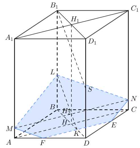 - Найдем косинус угла между построенной плоскостью и плоскостью основания. \(FE\) — ребро двугранного угла. \(FE \perp BK\), т. к. \(FE \parallel AC\), а \(AC \perp BK\) (диагонали квадрата). \(FE \perp LK\) (теорема о трех перепендикулярах). Далее \[\angle(FML, ABC) = \angle(LK, BK) = \angle BKL = \alpha.\] \(B_{1}D_{1} = 5 \sqrt{2}\), следовательно, треугольник \(B_{1}D_{1}S\) равнобедренный, \[\angle BKL = \angle SB_{1}D_{1} = 45° \quad \Rightarrow \quad \cos \alpha = \frac{\sqrt{2}}{2}.\]