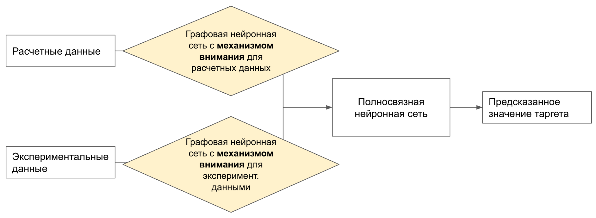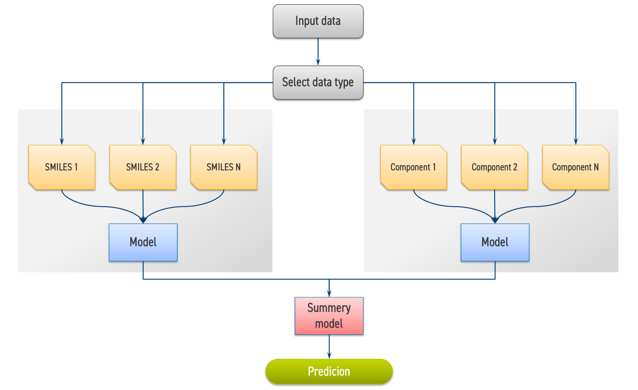 Образ финального решения должен состоять из модели(-ей), способной(-ых) предсказывать исследуемый параметр смазочного масла с произвольным количеством компонентов как для компонентов, представленных с помощью SMILES, так и для известных компонентов, представленных экспериментальными параметрами из приватного обезличенного датасета. На рис. 2.2 приведен примерный образ финального решения.