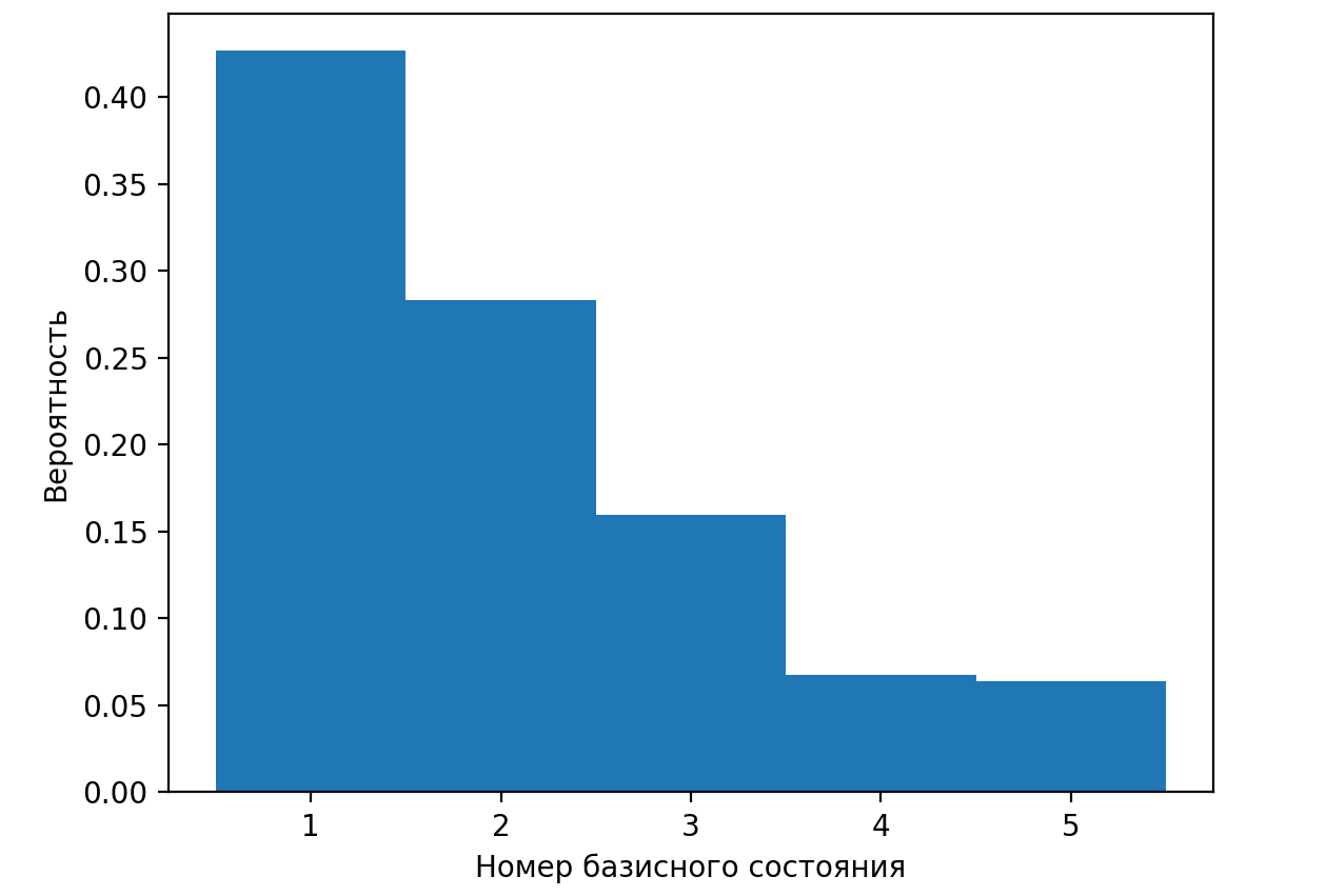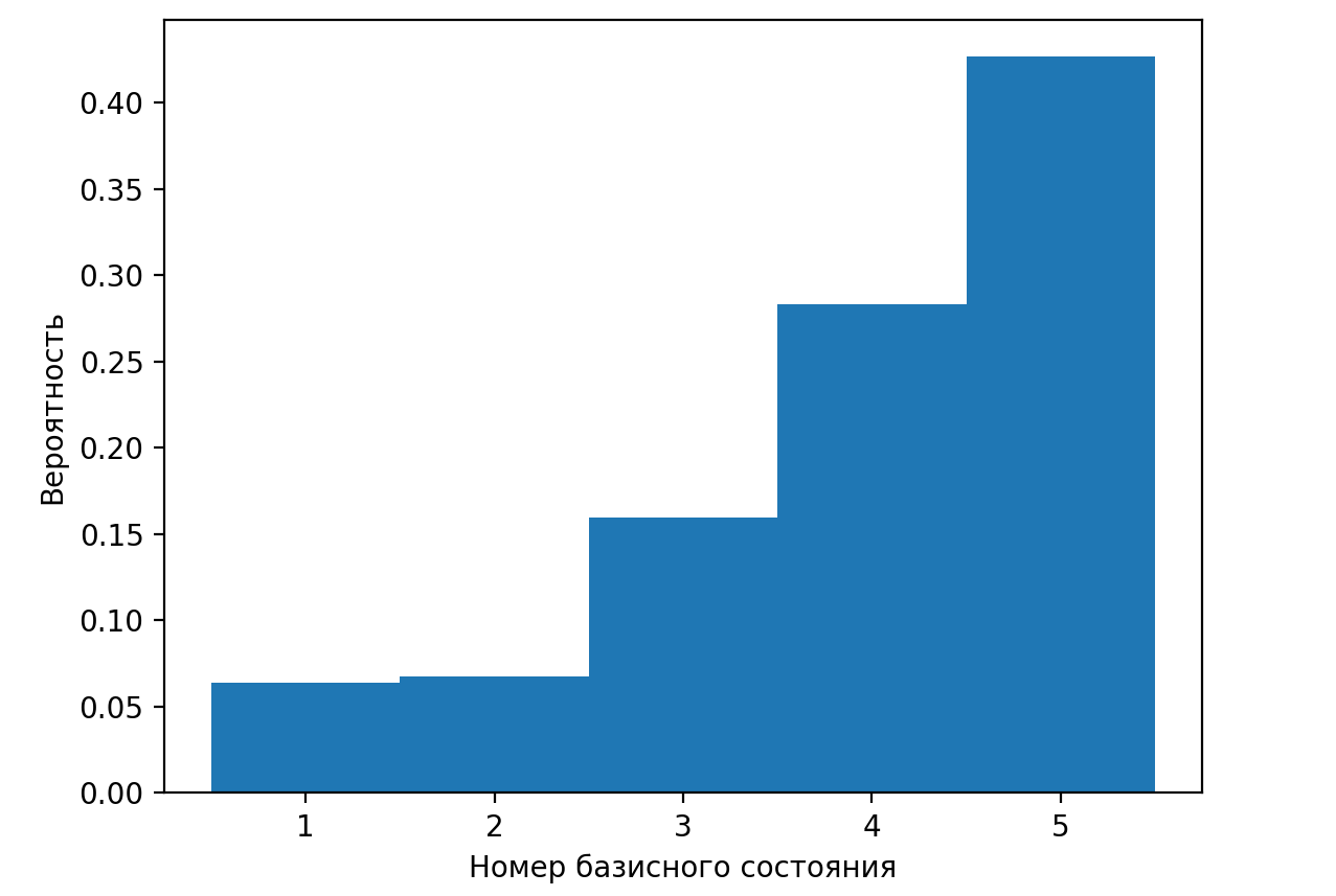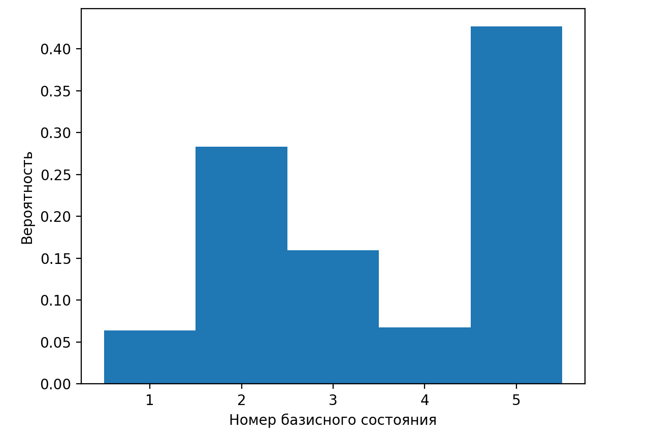 Сумма вероятностей всех возможных результатов измерения должна равняться единице, а вероятность отдельного исхода определяется квадратом модуля соответствующего числового коэффициента. Для приведенного вектора состояния сумма квадратов модулей числовых коэффициентов равна: \[P =\left(\sqrt{\frac{1}{10}}\right)^2+ \left(\frac{2}{3} \right)^2+\left(- \frac{1}{2}\right)^2+ \left(\frac{13}{40}\right)^2 + \left(- \frac{9}{11}\right)^2 =1{,}56951\neq 1.\] Чтобы \(P\) стало равно единице, состояние \(\ket{\Psi}\) необходимо домножить на величину: \[\frac{1}{\sqrt{P}} = 0{,}7982.\] Эта величина и является нормировочным коэффициентом.