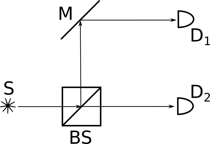 Источник S испустил одиночный фотон в квантовом состоянии: \[\ket{\Psi} =\sqrt\frac{1}{2} \ket{H} +\sqrt\frac{1}{2}\ket{V}.\] Определить числовой коэффициент при \(\ket{V}\) на входе в детектор \(D_2\) (рис. 1.2).