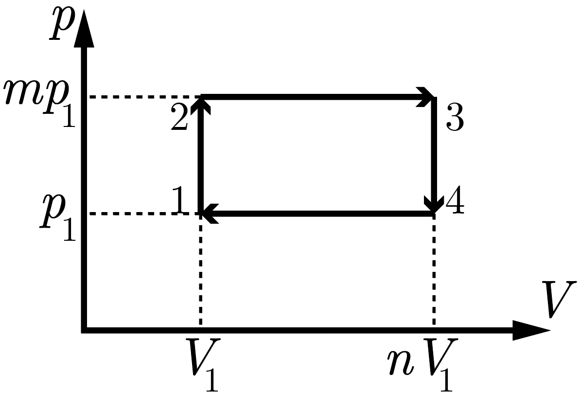 Изобразим цикл на \(pV\)-координатах: он имеет вид прямоугольника (рис. 2.3). Легко заметить, что площадь внутри этого прямоугольника (работа за цикл) \[A = (m-1)(n-1)p_1V_1.\]