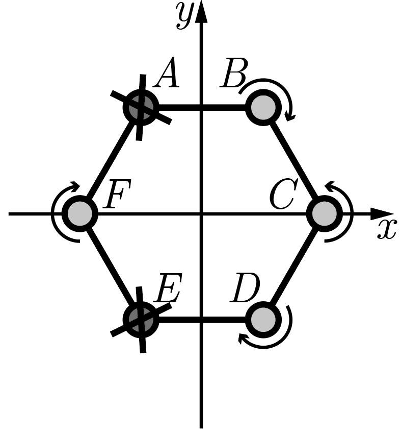 Прежде всего введем систему обозначений. Обозначим искомые скорости вращения уцелевших двигателей \(\omega_{B,C,D,F}\). Аналогично эти же индексы будем использовать для других величин, связанных с двигателем в соответствующей вершине. Величины, касающиеся работы двигателей до поломки, будем помечать индексом \(0\). Введем систему координат так, как это изображено на рис. 2.5: ось \(0x\) проведем через вершины \(F\) и \(C\), а \(0y\) — перпендикулярно ей. Начало системы координат поместим в центр масс мультикоптера. Сторону шестиугольника обозначим \(a\).