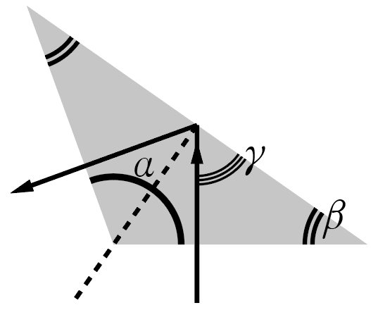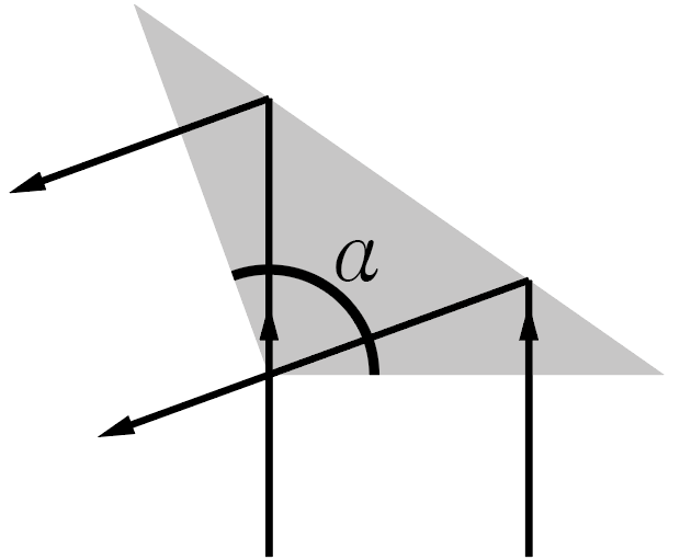Изобразим ход одного луча в призме (рис. 2.2). В силу симметрии, лучи выходят из призмы по нормали к ее границе раздела, поэтому полное внутреннее отражение возможно только на самой широкой стороне призмы. Найдем угол падения света на эту границу. Угол \(\beta\) при основании призмы легко найти, опираясь на сумму углов треугольника и равенство углов при основании равнобедренного треугольника: \[\alpha + 2\beta = 180° \Rightarrow \beta = 90°-\frac{\alpha}{2}.\] Угол \(\gamma\), который падающий луч составляет с широкой гранью призмы, можно найти, опираясь на сумму углов в треугольнике, образованном этим лучем и двумя гранями призмы. Поскольку первое падение по условиям задачи происходит по нормали (под углом \(90°\) к границе раздела), а угол между гранями равен \(\beta\), справедливо равенство \[\gamma + \beta + 90° = 180° \Rightarrow \gamma = 90° - \beta = \frac{\alpha}{2}.\] Наконец, угол падения луча \(\phi\) по определению является углом между падающим лучом и нормалью к границе раздела; следовательно, он равен \[\phi = 90° - \gamma = 90° - \frac{\alpha}{2}.\] Согласно закону Снеллиуса, критический угол \(\phi_\textrm{кр}\) полного внутреннего отражения достигается тогда, когда синус угла падения оказывается равен относительному показателю преломления сред: \[\frac{1}{n} = \sin \phi_\textrm{кр} = \cos \frac{\alpha_\textrm{кр}}{2}.\] При меньших углах падения (и, следовательно, больших углах \(\alpha\)) явление полного внутреннего отражения наблюдаться не будет. Отсюда \[\alpha_\textrm{кр} = 2\arccos\left(\frac{1}{n}\right) \approx 108°.\]