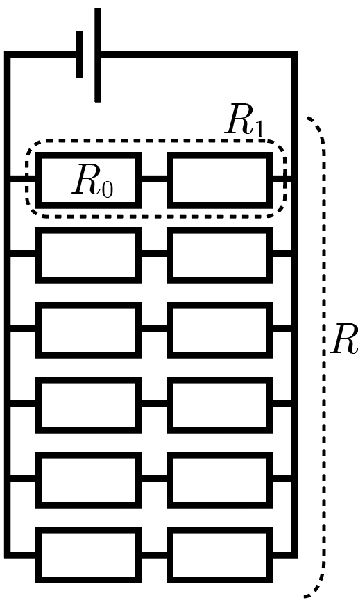 Обозначим сопротивление одного двигателя \(R_0\). Тогда эквивалентное сопротивление одной группы двигателей \(R_1 = 2R_0\), а шести таких групп, соединенных параллельно: \[R = \frac{R_1}{6} = \frac{R_0}{3}.\] По закону Ома для полной цепи через эту батарею будет протекать ток \[I = \frac{\mathcal{E}}{R + r} = \frac{\mathcal{E}}{R_0/3 + r},\] а значит, через каждый двигатель будет протекать ток, равный \[I_0 = \frac{I}{6} = \frac{\mathcal{E}}{2R_0 + 6r}.\] В то же время, при подключении двигателей по изначальному плану, эта сила тока составила бы \[I_0 = \frac{\mathcal{E}_0}{R_0}.\] Приравнивая эти два выражения, получим \[\frac{\mathcal{E}_0}{R_0} = \frac{\mathcal{E}}{2R_0 + 6r} \Rightarrow R_0 = \frac{6 r \mathcal{E}_0}{\mathcal{E} - 2\mathcal{E}_0}.\] Используя последние два соотношения, находим окончательно ответ на вопрос задачи: \[I_0 = \frac{\mathcal{E}_0}{R_0} = \frac{\mathcal{E}-2\mathcal{E}_0}{6r} = 10\textrm{\,А}.\]