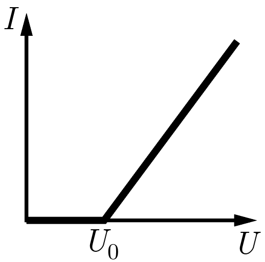 В управляющей цепи дрона используется нелинейный электрический элемент, вольт-амперная характеристика которого изображена на рис. 1.1: при напряжениях \(U\) меньше некоторого значения \(U_0\) ток через этот элемент не протекает вовсе, а при напряжениях \(U > U_0\) сила тока оказывается прямо пропорциональна разности \(U-U_0\). Известно, что при приложении к нему напряжения \(3U_0\) через элемент протекает ток \(I_1 = 4\textrm{\,мА}\), а при приложении очень больших (много больше \(U_0\)) напряжений нелинейный элемент ведет себя как резистор с сопротивлением \(R_1 = 3\textrm{\,кОм}\). Найдите \(U_0\).
