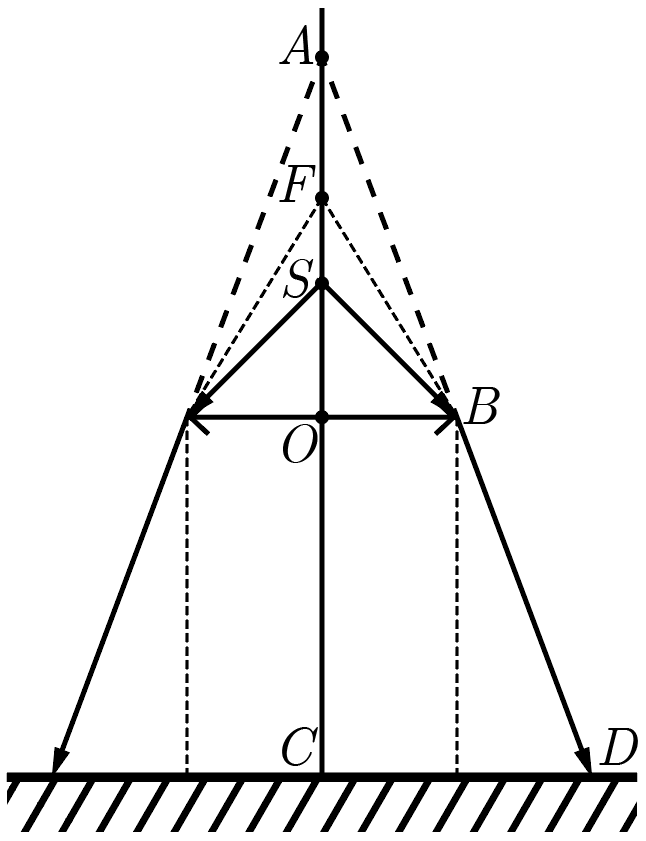 Когда источник света находится строго в фокусе линзы, прожектор создает пучок лучей, параллельных главной оптической оси и перпендикулярных экрану (поверхности Земли), а значит, независимо от высоты дрона, радиус светового пятна равен радиусу линзы. Чтобы увеличить площадь светового пятна в четыре раза, его радиус необходимо увеличить в два раза. Поскольку по условиям источник сдвигается вниз (ближе к линзе), линза сформирует его мнимое изображение. Изобразим ход лучей в этом случае на чертеже (рис. 1.2). На нем \(O\) — оптический центр линзы, \(F\) — ее фокус, \(S\) — источник после смещения, \(A\) — мнимое изображение источника в линзе, \(B\) — край линзы, \(C\) — центр светового пятна, \(D\) — его край. Сплошные стрелки изображают реальный ход световых лучшей, редкий пунктир — их продолжения, частый тонкий пунктир — ход лучей до сдвига источника.