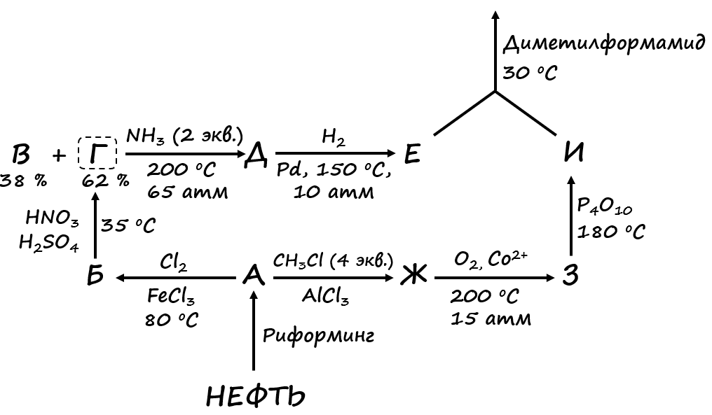 Спектр ЯМР 1H высокосимметричного вещества Ж, получаемого из A алкилированием по Фриделю – Крафтсу, показал, что соединение содержит два типа атомов водорода в соотношении \(6 : 1\). Вещества В и Г — изомеры, образующиеся после нитрования Б. На схеме (рис. 1.3) указаны их массовые доли в изомерной cмеси. В цепочке превращений участвует именно вещество Г, из которого получают Д, содержащее 52,17% углерода по массе. Расшифруйте структуры веществ A – И.