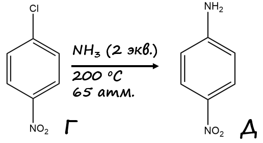 причем, именно 4-нитрохлорбензол — это вещество Г как более выгодный пара-изомер. 4-нитрохлорбензол аммонируется под высокой температурой и давлением, образуя амин (рис. 1.7).