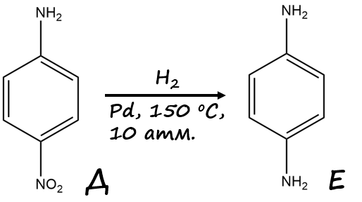 Вывод о структуре вещества Д можно сделать и по приведенной структуре полимера X. Получившееся вещество Д гидрируется на палладиевом катализаторе, в результате чего образуется п-фенилдиамин — вещество Е, рис. 1.8.