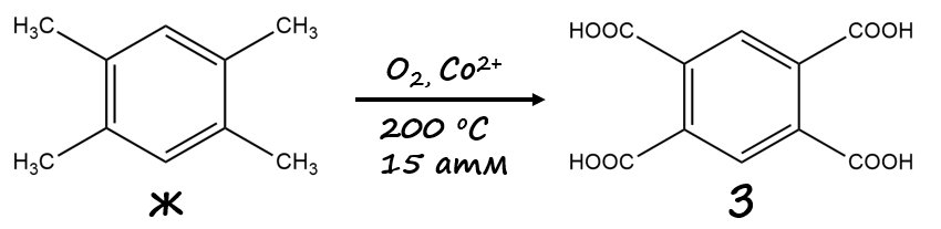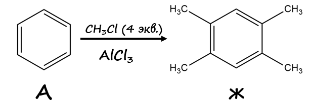 Далее расшифруем структуру соединения Ж. Оно получается в результате алкилирования бензола по Фриделю – Крафтсу, причем, стоит обязательно обратить внимание на то, что на схеме бензол и хлорметил вступают во взаимодействие в соотношении \(1 : 4\). Данные спектра ЯМР 1H говорят о том, что в структуре Ж содержатся два типа атомов водорода в соотношении \(6 : 1\). Учитывая высокую симметричность соединения, нетрудно догадаться о том, что это 1,2,4,5-тетраметилбензол (рис. 1.9),