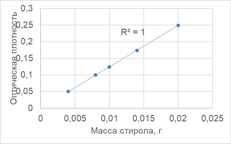 Используя данные таблицы 1, определите массовую долю в процентах остаточного стирола в образце полистирола с точностью до тысячных, учитывая, что вода и гексан стирола не содержали, органические примеси в экстракте из полимера не поглощают излучение при выбранной длине волны. Сравните результат с допустимым значением 0,05%.