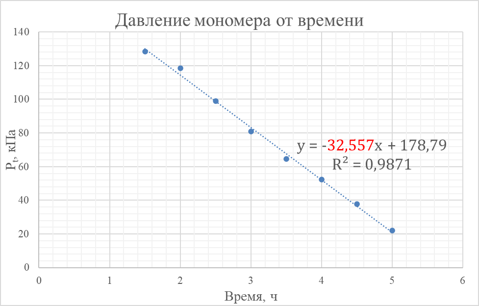 Используя регрессионный анализ, рассчитайте константу скорости реакции роста цепи полимера в килопаскалях в час с точностью до одного знака после запятой.