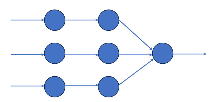 В случае какой архитектуры нейронной сети будет получено большее значение на выходе, если все входы (значения, принимаемые нейронами на первом слое) равны 0,5; в качестве функции активации везде принимается простая сигмоидная функция, все весовые коэффициенты равны 0,5.