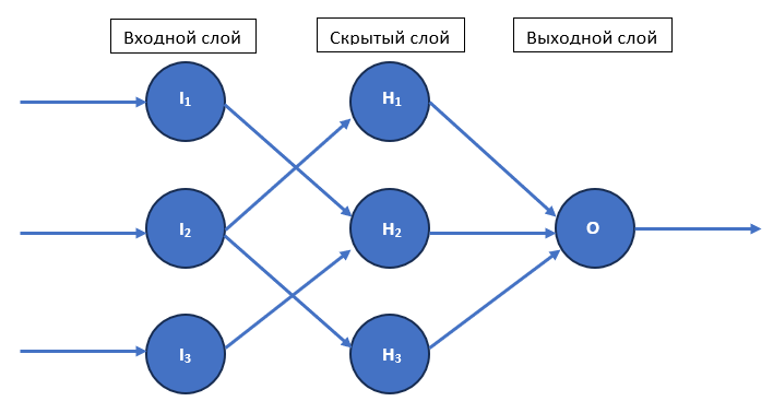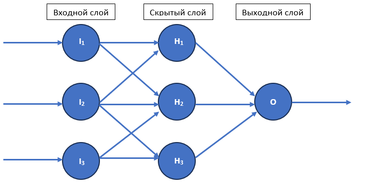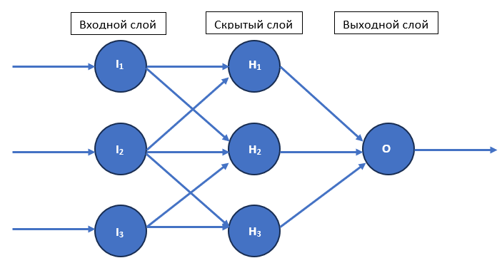 Для сигмоидной функции: \[\begin{aligned} H_1 &= H_3 = 0,5\cdot \frac{1}{1+e^{-0,5}} \approx 0,31; \\ H_2 &= 2\cdot 0,5\cdot \frac{1}{1+e^{-0,5}} \approx 0,62; \\ O &= 2\cdot 0,5\cdot\frac{1}{1+e^{-0,31}} + 0,5\frac{1}{1+e^{-0,62}} \approx 0,90. \end{aligned}\]