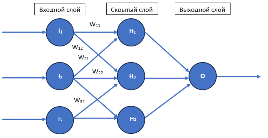 Ошибка на втором узле входного слоя \(I_2\) будет равна сумме ошибок, распределенных по связям \(W_{12}\), \(W_{22}\) и \(W_{32}\): \[e_{I_2} = e_{H_1} \cdot \frac{W_{21}}{W_{11} + W_{21}} + e_{H_2} \cdot \frac{W_{12}}{W_{12} + W_{22} + W_{32}} + e_{H_3} \cdot \frac{W_{23}}{W_{23} + W_{33}};\] \[e_{I_2} = \frac{1}{3} \cdot \frac{\frac{1}{2}}{\frac{1}{2} + \frac{1}{2}} + \frac{1}{3} \cdot \frac{\frac{1}{2}}{\frac{1}{2} + \frac{1}{2} + \frac{1}{2}} + \frac{1}{3} \cdot \frac{\frac{1}{2}}{\frac{1}{2} + \frac{1}{2}};\] \[e_{I_2} = \frac{1}{3} \cdot \frac{1}{2} + \frac{1}{3} \cdot \frac{1}{3} + \frac{1}{3} \cdot \frac{1}{2};\] \[e_{I_2} = \frac{1}{6} + \frac{1}{9} + \frac{1}{6} = \frac{4}{9} \approx 0{,}44.\]