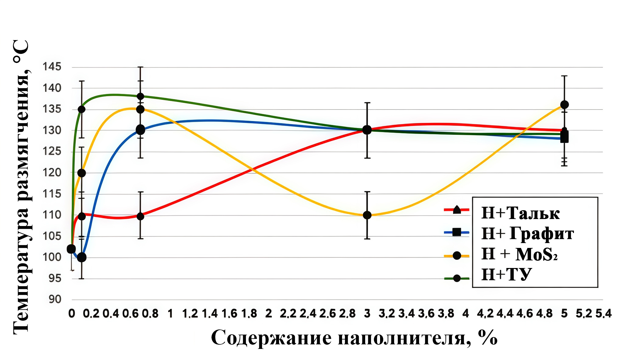 При содержании наполнителя 0,2–2,0% наблюдается рост температуры размягчения полимера. Это связано с тем, что частицы наполнителя выступают в роли армирующих агентов, усиливая межмолекулярные связи внутри полимерной матрицы.