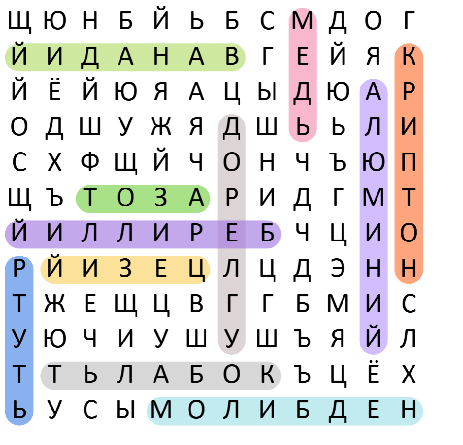Предлагаем ответить на вопросы, приведенные ниже, — они посвящены химическим элементам, входящим в состав полезных материалов. Ответы на них «спрятаны» в матрице на рис. 1.1: слова могут располагаться горизонтально и вертикально, размещаться слева направо \(\rightarrow\), справа налево \(\leftarrow\), сверху вниз \(\downarrow\) и снизу вверх \(\uparrow\), а также пересекаться.