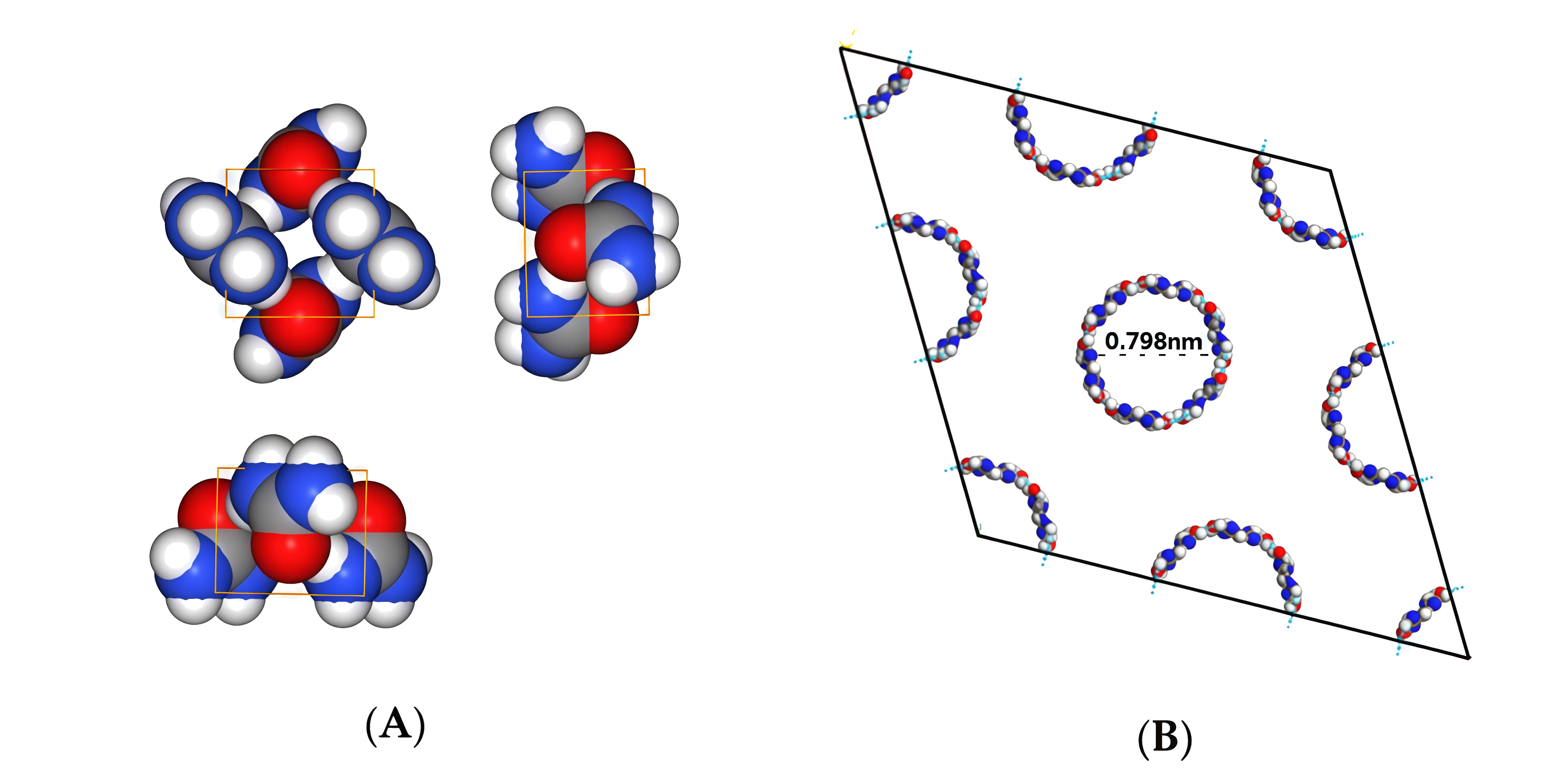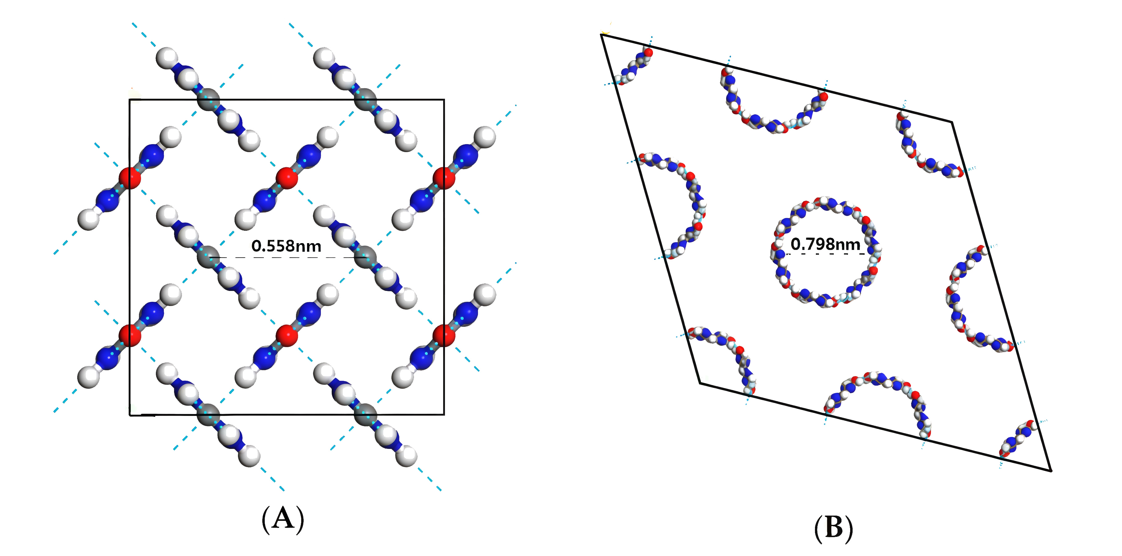 Рис. 1.3.Чистый карбамид имеет тетрагональную кристаллическую структуру (А, рис. 1.3), каждая элементарная ячейка которой представляет собой параллелепипед со сторонами \(a = b = 0{,}566\) нм, \(c = 0{,}471\) нм и включает две молекулы — в такой плотной решетке отсутствуют полости для размещения молекул другого вещества (на рисунке изображено несколько элементарных ячеек). При образовании комплекса с парафином кристаллическая структура карбамида меняется с тетрагональной (А) на гексагональную (В): в такой структуре молекулы карбамида образуют спиралевидные каналы, в которые входят молекулы парафина.