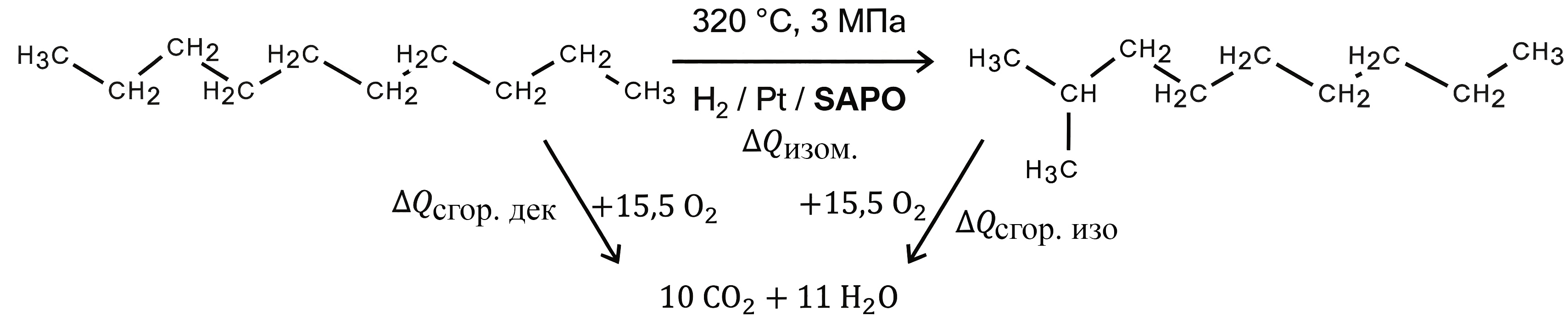 - Расчет теплоты реакции изомеризации — 2 балла; указание на понижение теплотворной способности топлива — 1 балл: 3 балла