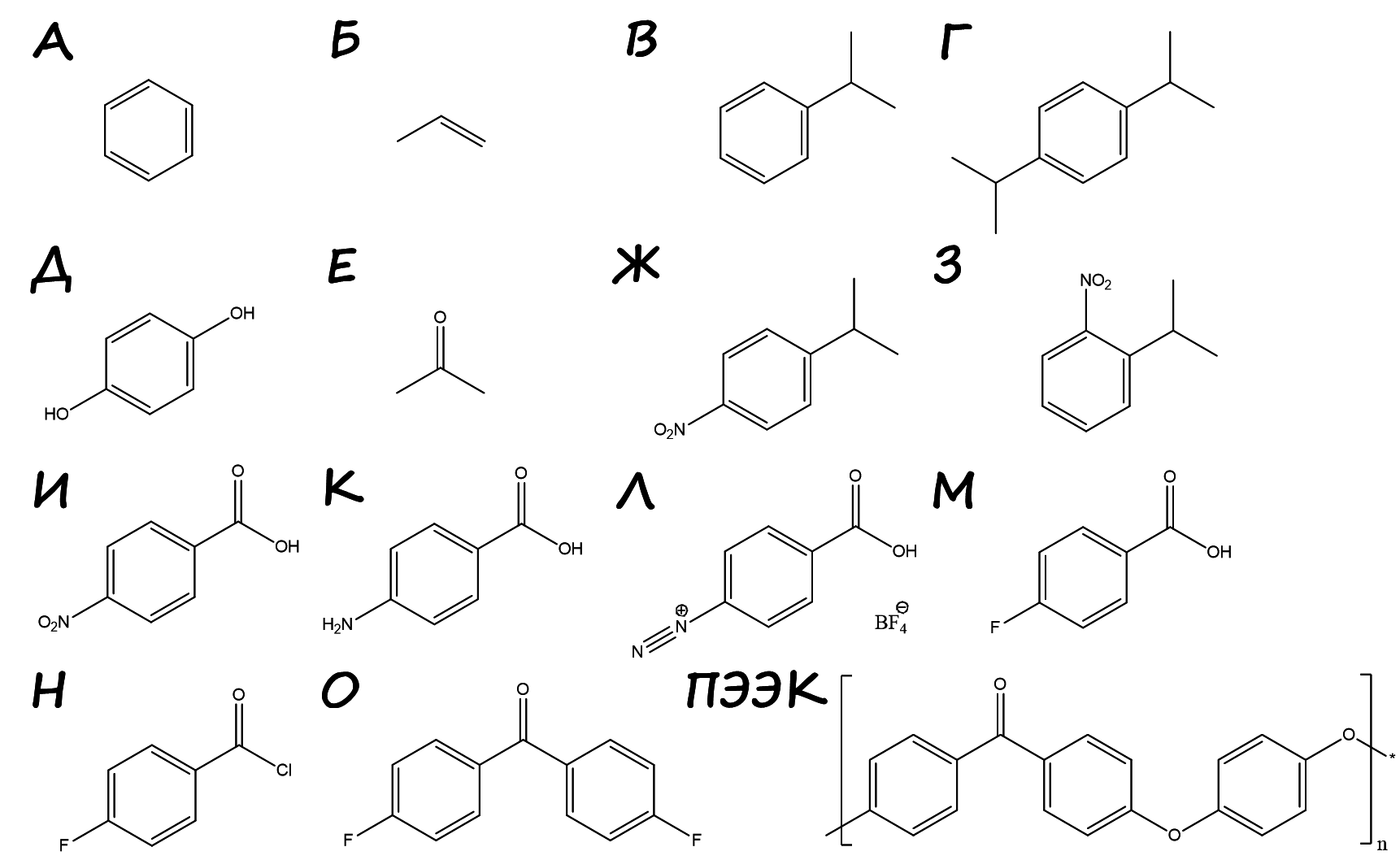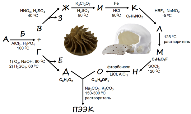 Железная стружка в соляной кислоте восстанавливает нитро-группу до амино-группы с образованием n-аминобензойной кислоты К. Ее диазотируют с образованием тетрафторбората диазония Л (принимается указание катиона диазония), которая при разложении образует фторбензойную кислоту М (реакция Шимана). Обработка тионилхлоридом является классическим методом получения хлорангридов (Н), который ацилирует фторбензол по Фриделю – Крафтсу с образованием О. В основных условиях (в присутствии карбонатов натрия и калия) гидрохинон Д депротонируется и вступает в реакцию нуклеофильного замещения с 4,4\(^{\prime}\)-дифторбензофеноном О, образуя ароматических полиэфирэфиркетон (поскольку на одно звено приходится две эфирных и одна кето-группы). Структуры веществ приведены на рис. 2.4.