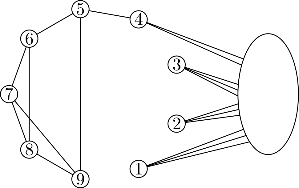 Приведем пример, когда \(n = 11\). «Группа одиннадцати» обозначена на рисунке овалом, а вершины «группы девяти» отмечены пронумерованными кругами.