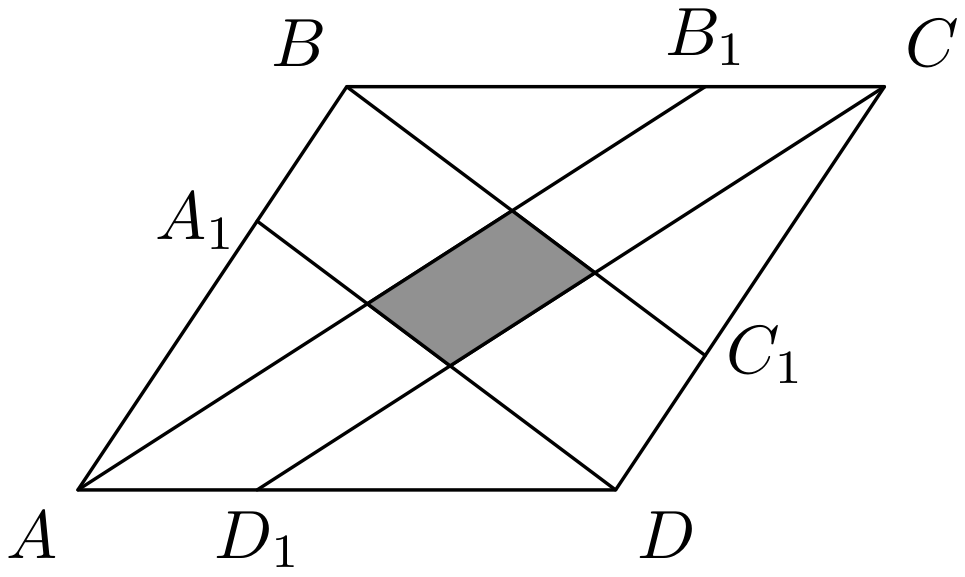 На сторонах параллелограмма \(ABCD\) отмечены точки \(A_{1}\), \(B_{1}\), \(C_{1}\), \(D_{1}\) так, что \(AA_{1}:A_{1}B = BB_{1}:B_{1}C=CC_{1}:C_{1}D=DD_{1}:D_{1}A = 2:1\). Найдите отношение площади параллелограмма \(ABCD\) к площади закрашенной фигуры (см. рис. 1.1).