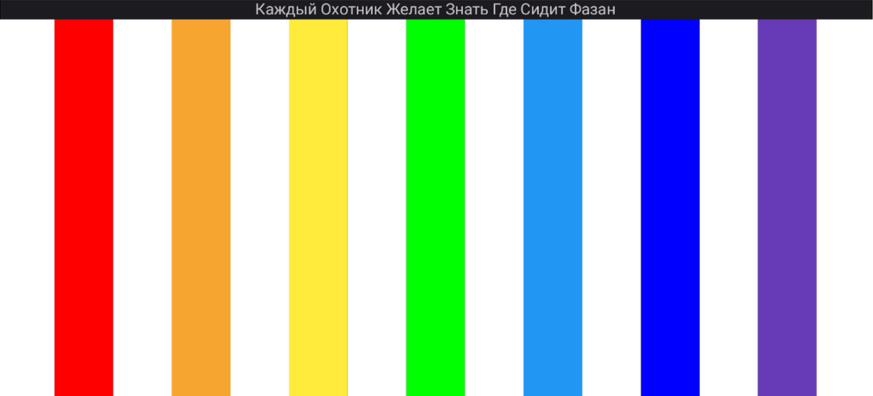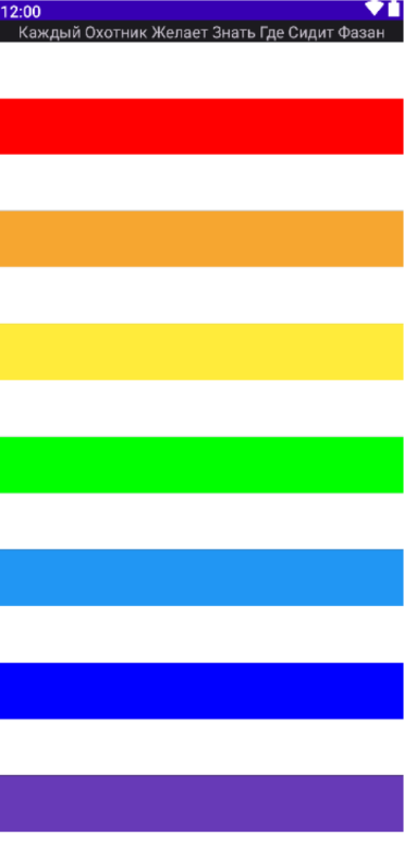 ViewGroup(например,FrameLayout,LinearLayoutи т. п.) с идентификатором@id/outer_layout, включающим только элементыViewв виде полос (вертикальные для альбомной ориентации и горизонтальные для портретной ориентации). - Каждая полоса соответствует необходимому цвету радуги, разделенному между собой белым цветом (белый, красный, белый, оранжевый, белый, желтый, белый, зеленый, белый, голубой, белый, синий, белый, фиолетовый, белый).