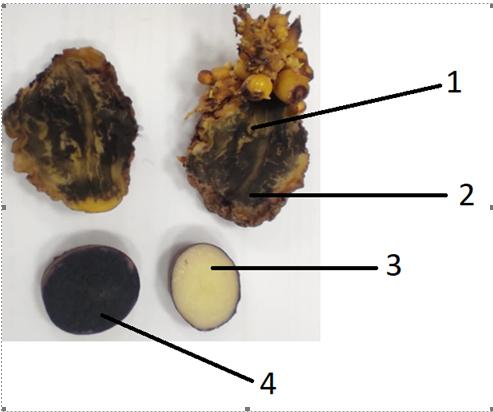 Задание 7. (6 баллов) В лаборатории был проведен эксперимент по окрашиванию клубней картофеля реактивом Q разного срока хранения. Рассмотрите рис. 1.10, на котором представлены результаты. Объясните разницу в окрашивании, указанную под цифрами 1, 2, 3, 4. Ответ обоснуйте.