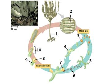 На рис. 2.7 представлена схема жизненного цикла Saccharina latissima. Письменно охарактеризуйте основные стадии, обозначенные цифрами 1–10, с указанием плоидности.