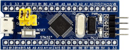 | 1 | Установите плату Blue Pill на материнскую плату. Важно! Разъем microusb на плате BluePill должен находиться над надписью USB SIDE. |