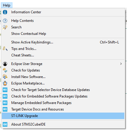 После этого, возможно, ST-Link попросит обновления. Для этого во вкладке меню Help есть соответствующая опция. Если ST-Link не просит обновления, просто пропустите этот шаг.
