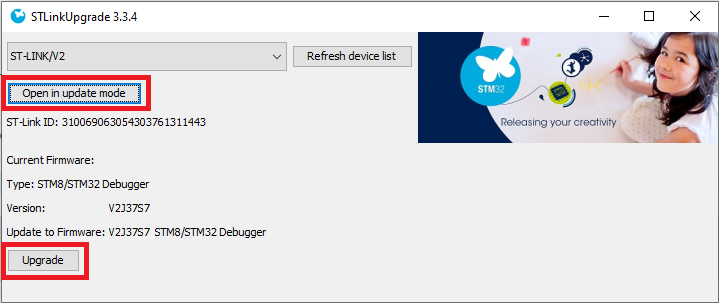 Выберите ST-LINK Upgrade. Откроется новое окно. В нем выберите среди устройств ST-LINK/V2, а затем — Open in update mode. После этого нажмите Upgrade.