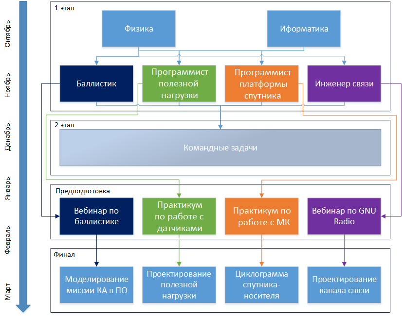 В 2024–25 гг. на первом этапе в рамках инженерного тура проводится подготовка по выделенным ролям в команде: физик-баллистик, программист полезной нагрузки, программист платформы спутника и инженер связи.