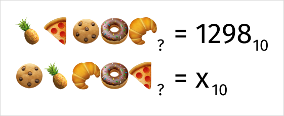 Сопоставляем символы с получившимся числом: «ананас» — 2, «пицца» — 0, «печенье» — 1, «пончик» — 4, «круассан» — 3. Из этого следует, что в нижней строке слева от знака равенства стоит число \(12340_5\).