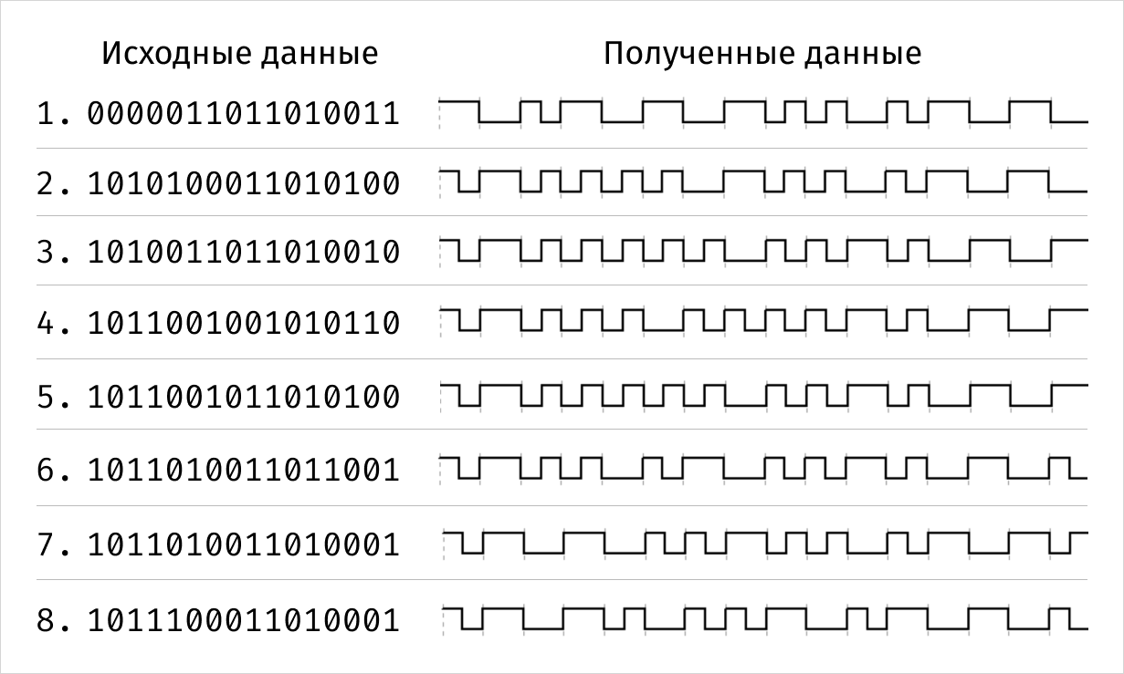 Манчестерское кодирование представляет собой кодировку двоичного разряда двумя тактами, где значение (ноль или единица) определяется характером изменения уровня между двух тактов. В системе, представленной в задаче, единица кодируется изменением уровня между двух тактов, а ноль — отсутствием изменения. По сути, это дифференциальное манчестерское кодирование со сдвигом на один такт вперед.