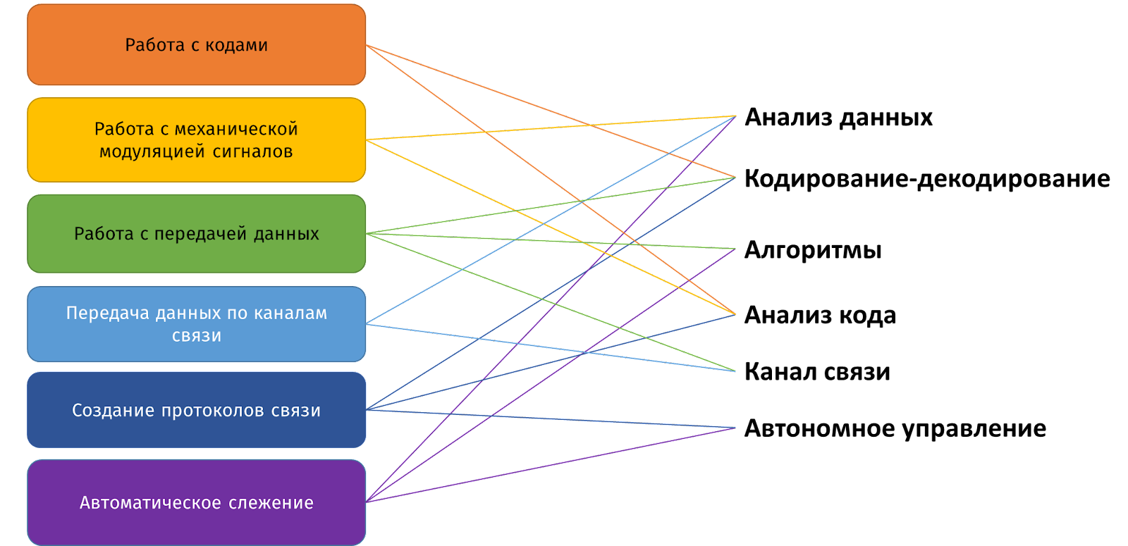 Команды работают со слежением за подвижным объектом и источником сигнала, кодированием и декодированием сигналов, изучают характер шумов, а также создают собственные протоколы передачи данных с учетом определенных требований к надежности, характеру помех в канале, скорости передачи и взаимосвязи данных в многоканальных системах.