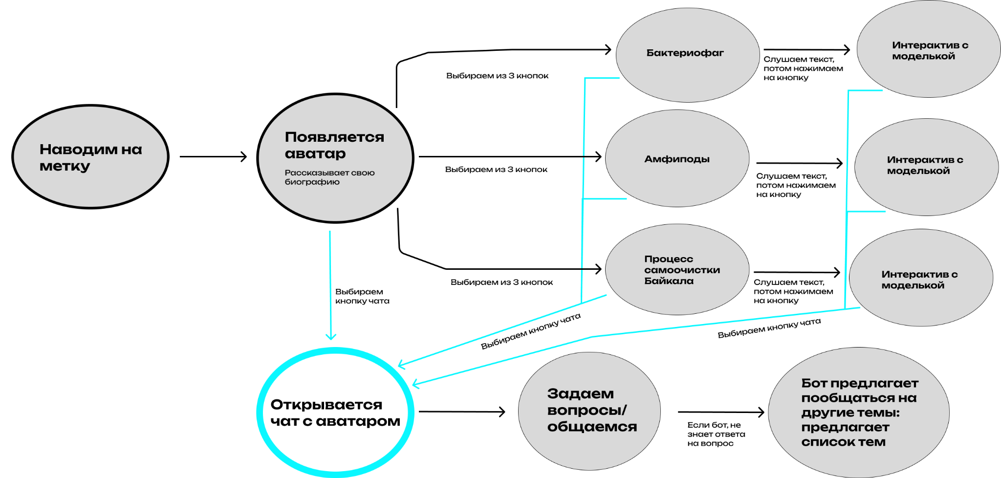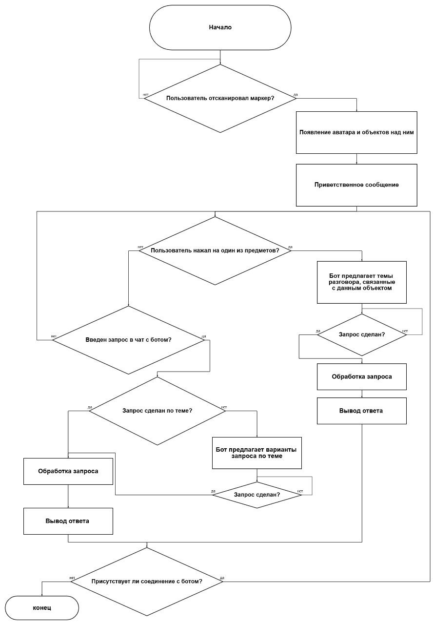 | Создание анимации ученых | Добавление интерактивности оверлея (например, нажатия) | Расширение интерфейса взаимодействия с AR-контентом через внедрение жестов и или распознавания лица | Обработка вопросов вне тематики бота |