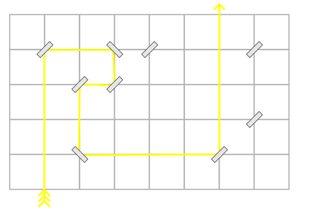 Размеры тестовых данных позволяют использовать пошаговый алгоритм, отслеживая путь лазерного луча с учетом направления движения. На каждом шаге проверяйте достижение границы поля (конец пути) или наличие зеркала. Смену направления луча на месте зеркала удобно выполнить, используя словарь. Нет необходимости создавать сетку в виде двумерного массива, достаточно создать словарь с ключом в формате \((X, Y)\), содержащем сведения о зеркалах.